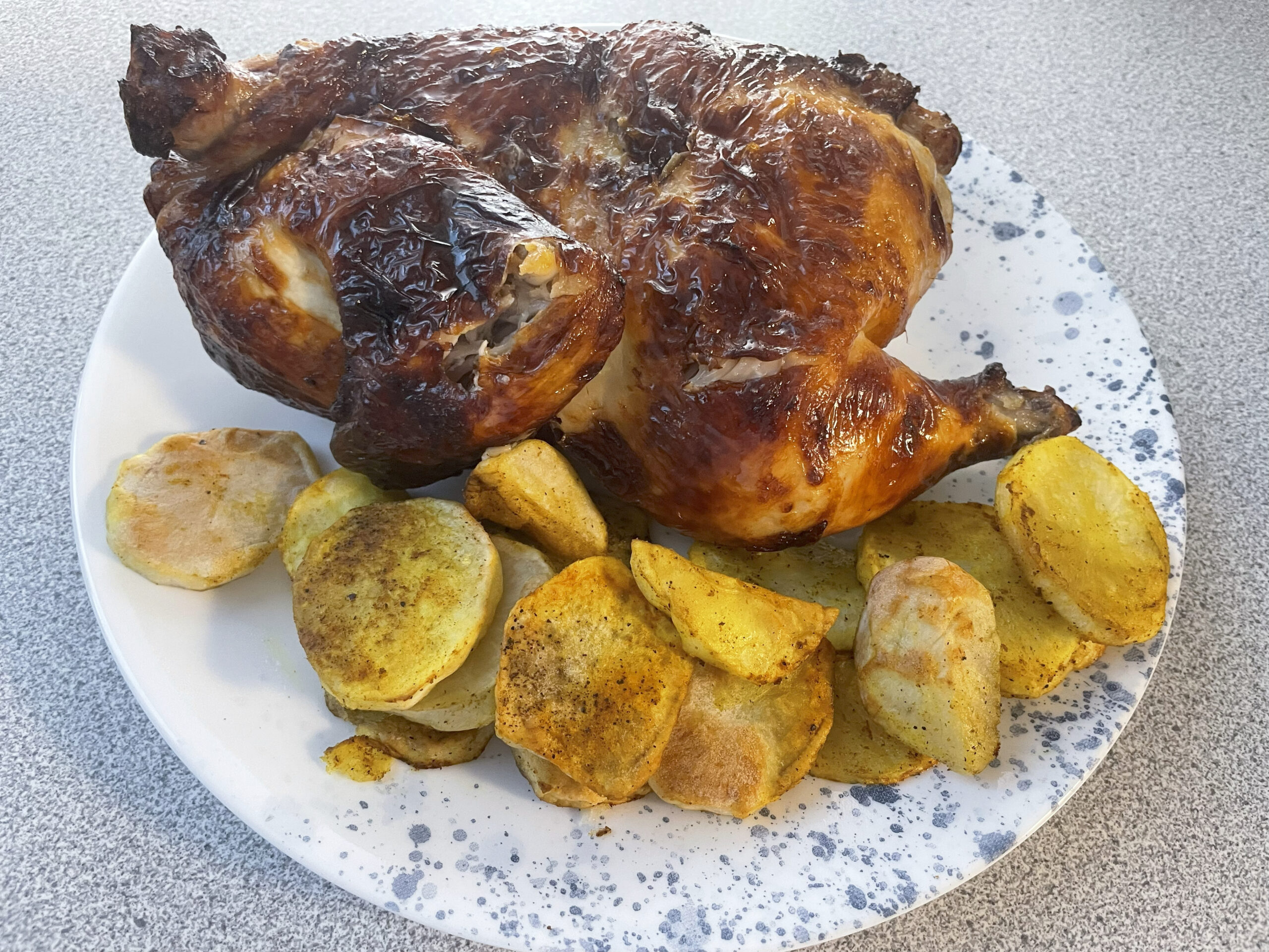 - Start laying out a large piece of parchment paper or use a large plate. Ensure the chicken has bee rinsed off, then pat dry with paper towels.Use 4 fingers worth of Kosher salt and sprinkle some on the top, bottom and inside of the bird if you’re using a whole one.Now let it rest in your kitchen for 30 minutes.Place the ½ chicken in the marinading bag and add 1 cup of Butter milk.If you’re using a whole chicken and using a larger bag, use 2 cups of Buttermilk.Now add 2 tbsp of kosher salt, seal the bag, and massage the bag a bit and refrigerate at least 2 hours, but over night is best. The marinating chicken will stay fresh like this for 2 nights maximum.After marinating, have a large pan or plate with a cookie sheet rack, and place the chicken on top to drain, this should only take 5-10 minutes.There are 2 cooking methods, Ninja Foodi air fryer, or your oven method using a cast iron frying pan, if you don’t have this, use a baking dish.Air fryer method: place the chicken inside the frying basket and cook on “Roast” at 400F for 15 minutes, then turn it down to 375 for 15 mins. Turn the bird over and cook for another 10 minutes. Using a cooking probe ensure the internal temperature is 160F. If it isn’t cook it a bit longer in 5 min increments. When the chicken is cooked, the outer skin will golden brown. Save any juices at the bottom of the basket.Oven method: Ideally you should use a cast iron skillet, if not use anything that is oven proof. Preheat the oven to 425F. Once ready place the bird into the back left corner (I’m told that’s where it’s the hottest, set your timer for 20 mins.After that, turn it down to 400F and place it in the back right corner for 10 mins, turn the bird over.After the first 10 mins, turn the bird over again to finish with the breasts up.Using a cooking probe ensure the internal temperature is 160F. If it isn’t cook it a bit longer in 5 min increments. When the chicken is cooked, the outer skin will golden brown. Save any juices at the bottom of the pan.Take the cooked chicken out of the oven and let it rest for 10 mins, giving the proteins time to relaxNow enjoy your Tender, Moist, Delicious butter milk roasted chicken.This pairs well with your favorite side, but roasted sliced potatoes or sweet potatoes works well. Add a fresh tossed salad, and you’re in business.